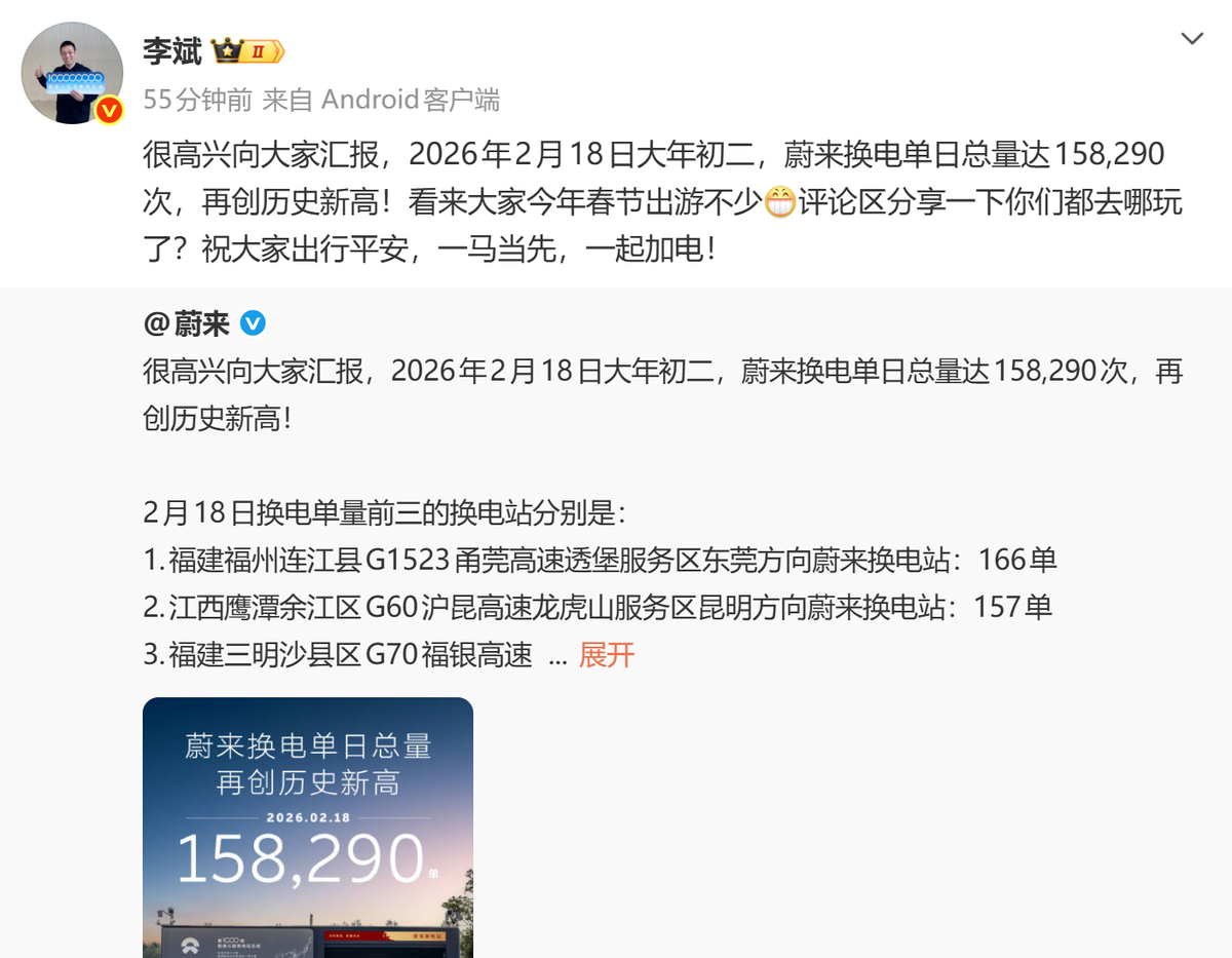 从2月6日蔚来达成1亿次换电里程碑开始,李斌就开始在微博频繁分享换电优势。李斌甚至将微博头像更换为手托“蔚来一亿次换电达成”蓝牌的照片,表达对换电业务的长期看好。