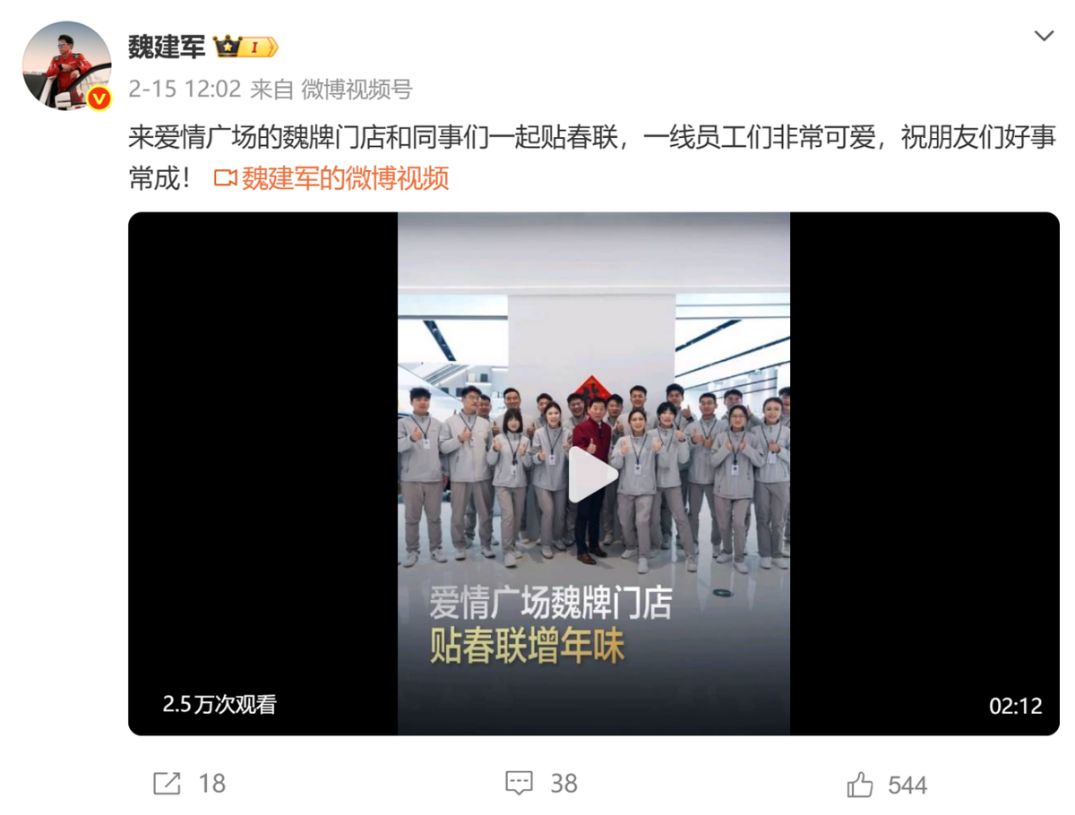 放假第一天,魏建军前往长城汽车模具中心,看望加班的同事们,感谢大家为技术创新的付出。大年初一,魏建军又马不停蹄的到魏牌门店,和一线员工一起贴春联、送祝福。虽然这些内容论声量,比不上其他车企大佬,但是论勤奋程度,论企业担当,魏建军依旧不遑多让。