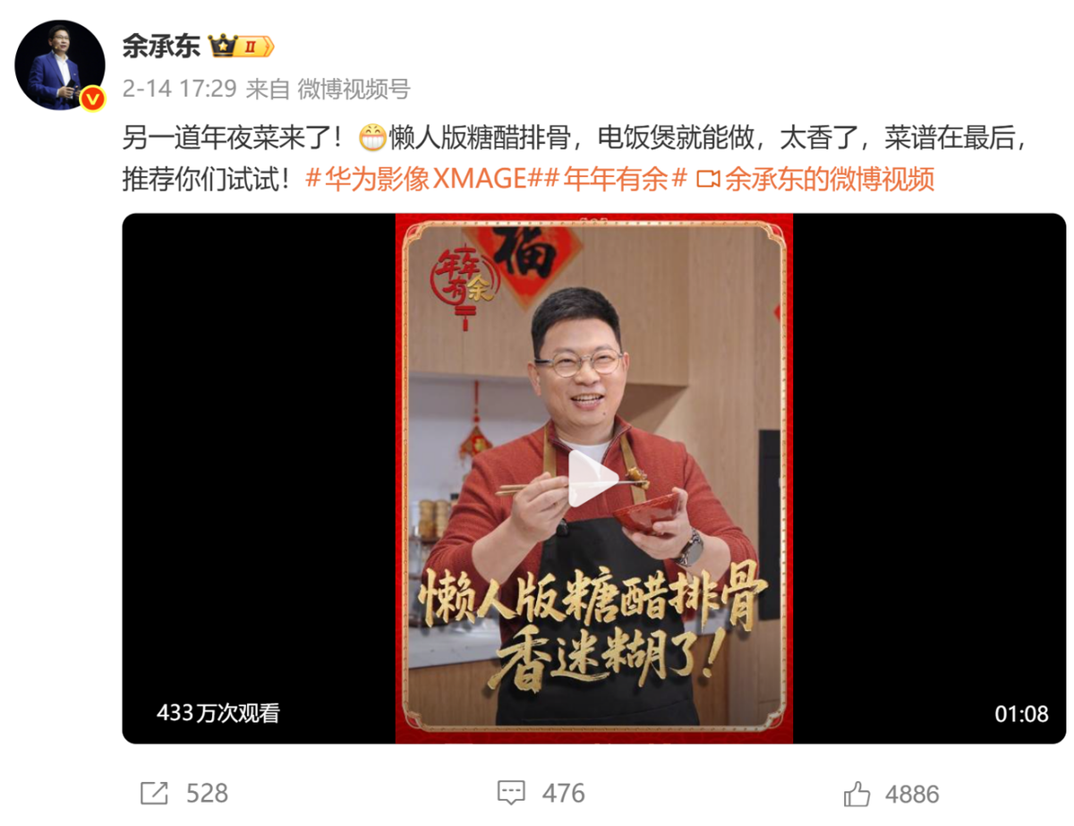 节前,余承东便高调宣布,尊界S800将在除夕夜登上央视春晚舞台,向全球观众展示中国高端智能汽车的实力。春节期间,他则是一边化身“美食博主”,教网友做家乡年夜菜,分享团圆时刻的烟火气。视频中,他全程亲自动手,从片鱼到浇油,每个环节还不忘展示华为手机的拍摄能力。